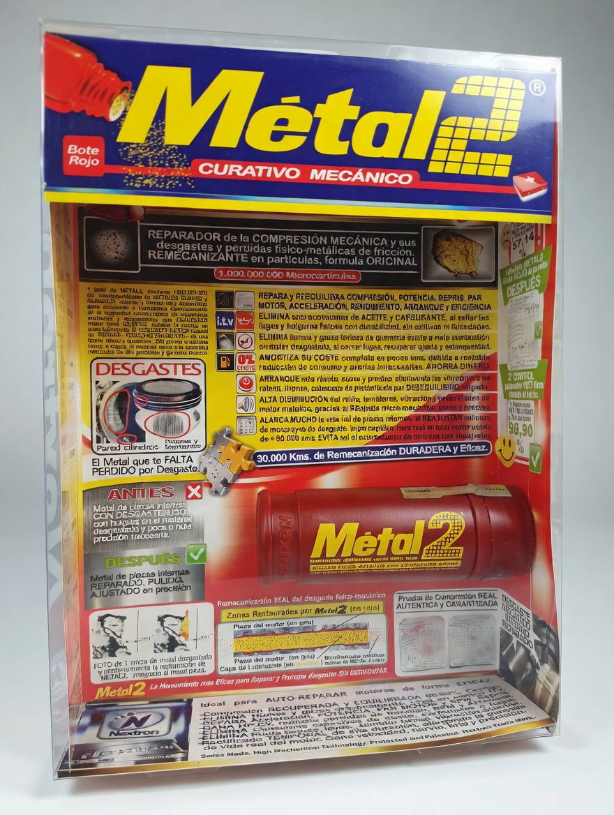 Métal2, Fórmula clásica original del "NEXTRON METALLIC", Remetalizante, Reparador y Restaurador Curativo del motor. Bote Rojo - 90 grs. Fórmula clásica especial Motores usados de cilindrada hasta 2.000 cm3 de cilindrada o 5 litros de aceite en capacidad de cárter.- El 1er remetalizante Suizo creado en 1979 a base de metal puro en micropartículas activas de metales especiales que reemplazan al vacio dejado por el desgaste de forma eficaz, duradera y técnicamente impecable. 40 años después de la primera fórmula, las fórmulas actuales de éste eficaz reparamotores, ofrecen todavia mejores resultados de altísima calidad y precisión - Ésta fórmula especial para motores usados a partir de 80.000 kms. y hasta 2.000 cm3, es ideal en compresión baja, desequilibrada, o rayas, fugas y pérdidas de metal entre las piezas de contacto metal-mecánico y su fricción por desgaste diario a de cada kilómetro que el motor realiza. No contiene polímeros ni otros compuestos lubricantes, sino metal puro de reparación activa. Permite un ajuste a la micra en las zonas dañadas, devolviendo el repris, la potencia y la regularidad de funcionamiento, el par motor, la compresión equilibrada, un arranque preciso y consumos muy ajustados debido a la reparación real, a la micra de las holguras de metal gracias a la re-mecanización que regenera con metal físico, la superfície desgastada, recuperando su planicidad original y precisión de ajuste. No existen parecidos. Desconfie de productos nano o simples capas o films lubricantes que sólo deslizan mejor, pero NO reparan, ni con lacas, gomas o resinas varias combinadas o geles de alta viscosidad. No se confunda o no reparará. La duración de ésta rectificación temporal es de 22.000 a 30.000 kms. No confie en falsos remetalizantes con mucho volumen de varias aplicaciones, sólo es lubricante. Es necesario metal, no liquidos. No funcionan y no resisten porque sólo son "parecidos" publicitarios que no remetalizan y sólo lubrican cambiando viscosidades o deslizando con sales de cerámica, sales de grafito autolubricante, bisulfuro de molibdeno negro o polímeros plásticos varios. Esto NO son remetalizantes ni activos de metal puro y específico, y sus resultados tampoco no son los de una remetalización técnica. Son simples aditivos de lubricante y para el lubricante, con un sinfin de mejoradores de lubricidad. Por el contrario, METAL2 OPTIMIZA POR COMPLETO EL AJUSTE METAL-MECÁNICO del motor en sus piezas de fricción interna fundamentales, al sellar de forma mecánica y microscópica cualquier fuga por desgaste que éste pudiera tener entre metal y metal donde haya fricción o desgaste continuado. La recuperación o mantenimiento equilibrado del par motor, repris, potencia, nervio, aceleración y prestaciones en conjunto es obvia. Además de una compresión recuperada y equilibrada evitando vibraciónes realmente asombrosa, demostrable y técnicamente segura. Puede consultar a nuestro técnico por whatsapp si desea más información. Estamos para ayudar y reparar.